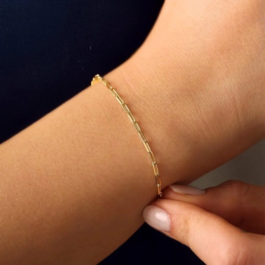Bu modern ve zarif 14 ayar altın ataç bileklik,stil sahibi kadınlar için tasarlanmıştır .Minimalist bir parçadır. Ataç formundaki zincir halkaları, bileğe sade ama şık bir görünüm kazandırırken, altının ışıltısını sofistike bir şekilde yansıtır.Özellikler: