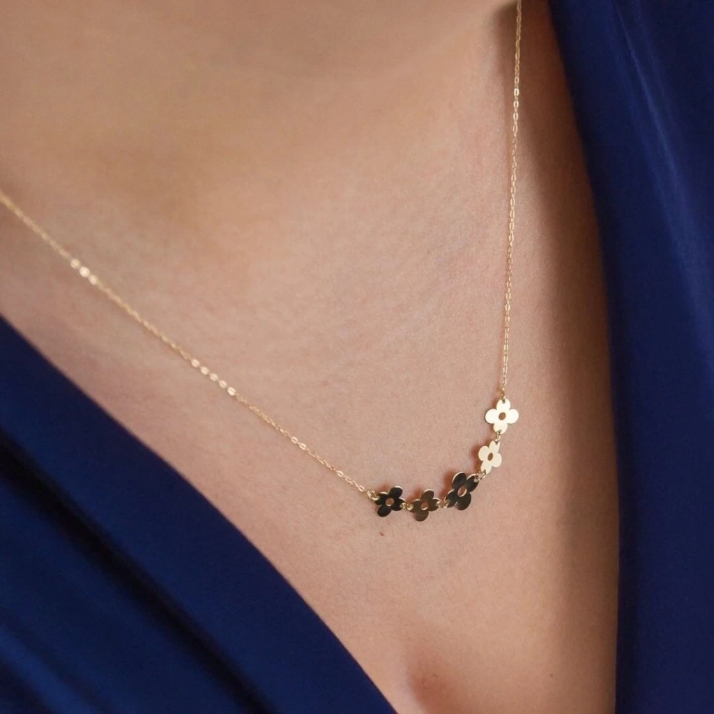 Evla Kuyumculuk'un özgün ve zarif tasarımlarından biri olan 14 Ayar Altın Beş Pullu Yonca Kolye,şansı ve zarafeti bir araya getiriyor. Bu özel kolye, 1,15 gram ağırlığındaki 14 ayar altınla özenle işlenmiştir. Kolyenin beş pullu yonca motifli tasarımı, zarafet ve şansı vurgularken, altının parlaklığı da dikkat çekici bir şekilde öne çıkar. Evla Kuyumculuk, bu kolyeyi özgün bir stil ile tasarlamış ve her ayrıntısına özen göstermiştir.