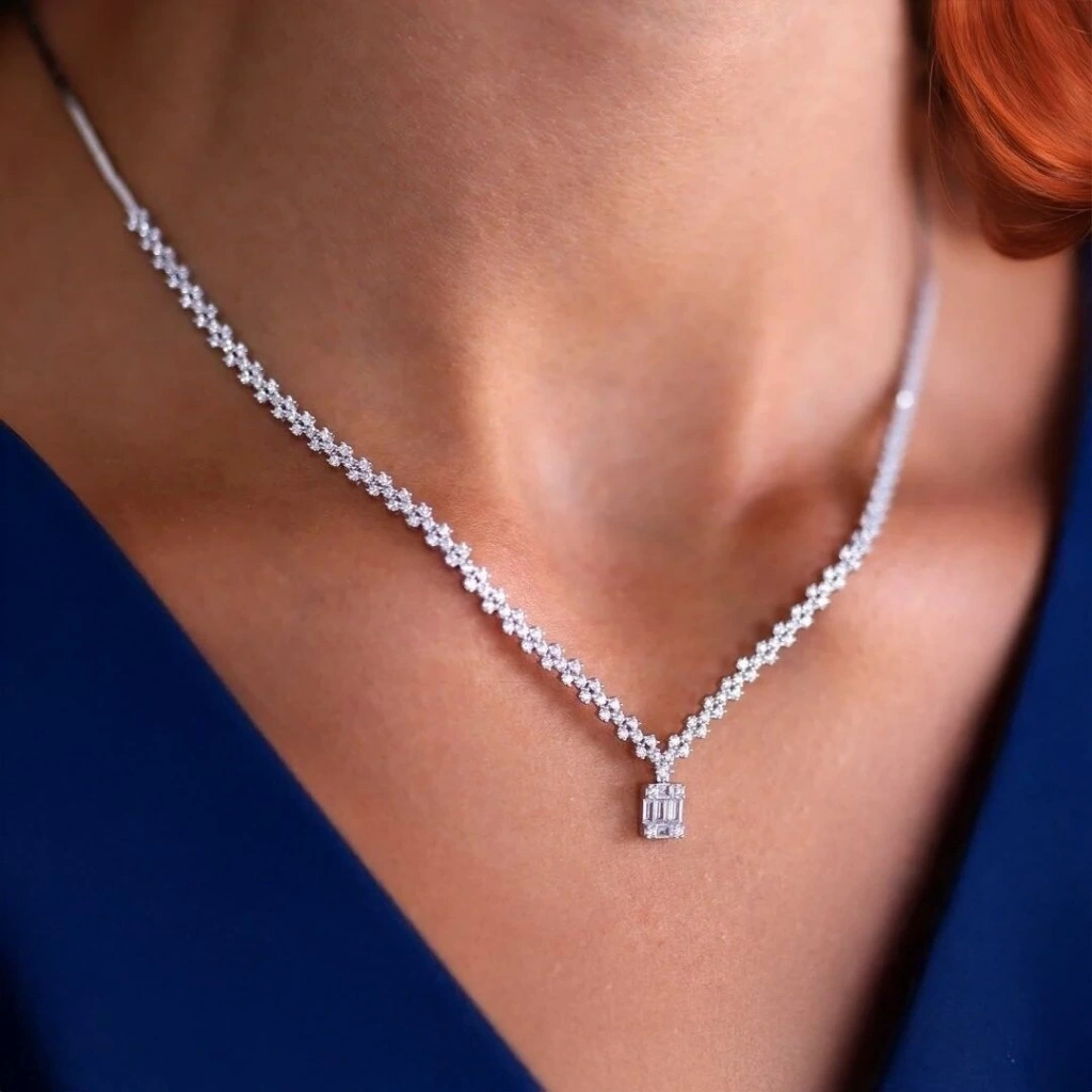 Kolye, 45 cm uzunluğundadır ve baget kesim taşlarla süslenmiş zincir şeklindedir.