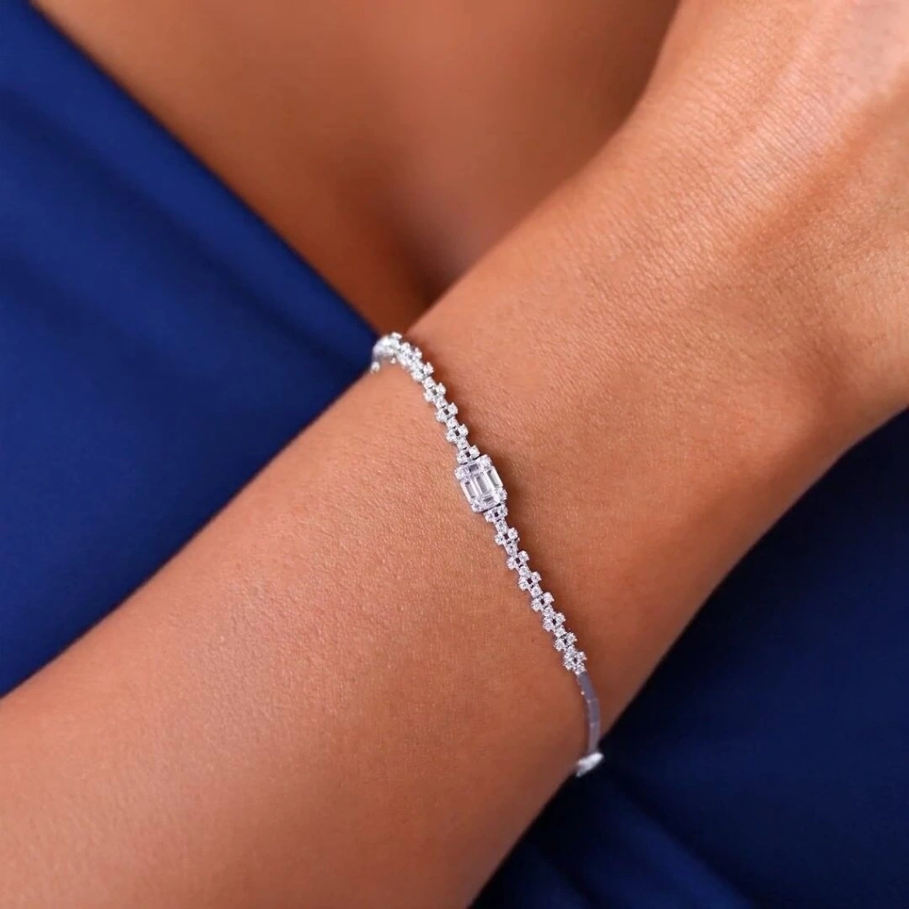 Bileklik, 19 cm uzunluğundadır ve baget kesim taşlarla süslenmiş zincir şeklindedir.