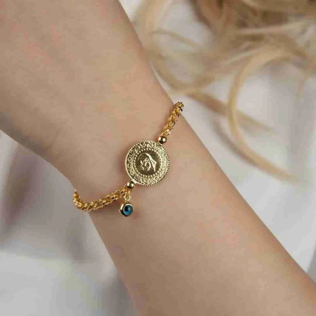 Evla Kuyumculuk'un özel tasarımı olan 14 Ayar Altın Çeyrekli Bileklik, zarif ve göz alıcı bir takı parçasıdır. Bu bileklik, yüksek kaliteli 14 ayar altından üretilmiştir ve şıklığıyla dikkat çeker. Bilekliğin ana özelliği, içerisinde yer alan 7,01 gram ağırlığındaki çeyrek altındır. Bu çeyrek, bilekliğe benzersiz bir değer ve anlam katmaktadır. Altın çeyrek, bilekliğin tasarımına entegre edilmiş ve estetik bir şekilde sunulmuştur.