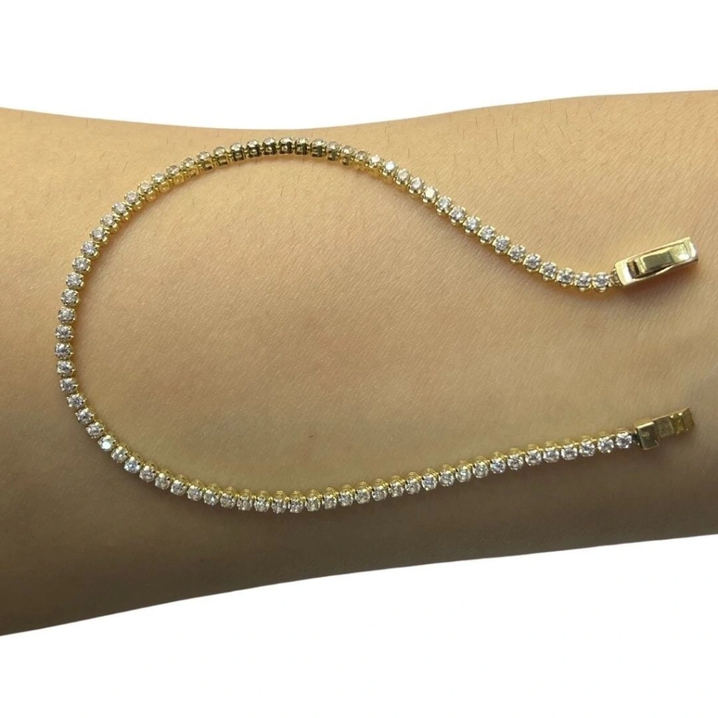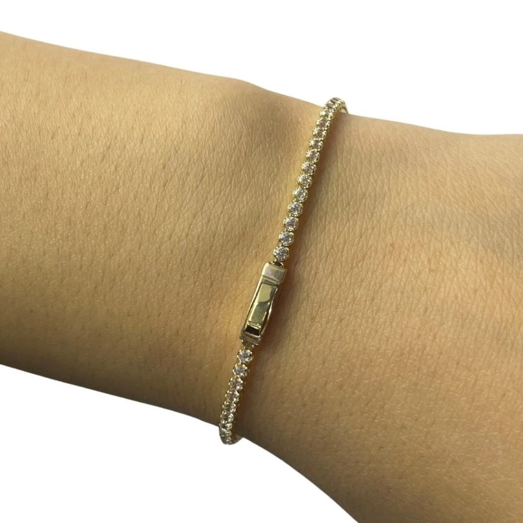 Bu zarif ve göz alıcı 14 ayar altın su yolu bileklik, ince işçiliği ve parlak taş detayları ile şıklığınızı tamamlayacak harika bir aksesuardır. Su yolu tasarımı,Bileklik boyunca sıralanmış taşlarla oluşturulan sürekli bir akış efekti verir . Işığı mükemmel bir şekilde yansıtır.Özellikler: