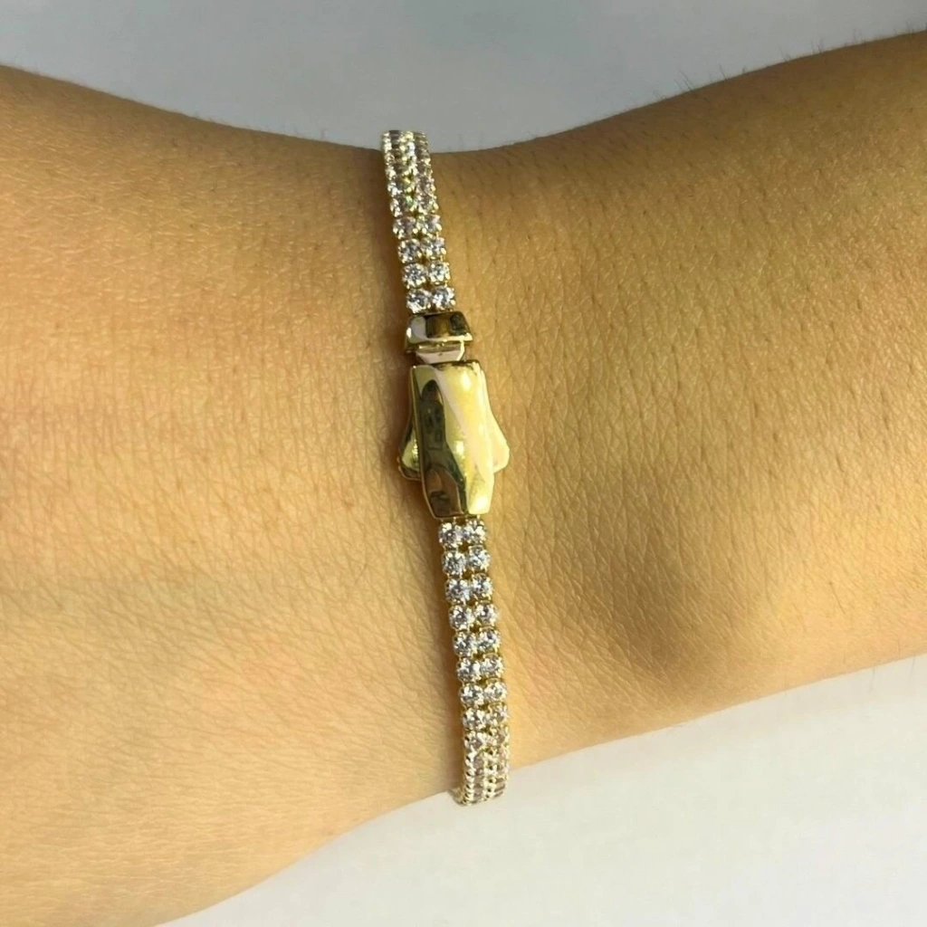 Kullanım: Çift sıra taşların sunduğu ekstra parlaklık, bu bilekliği hem gündelik kullanımda hem de özel davetlerde öne çıkan bir aksesuar haline getirir. Lüks görünümü ve zarif yapısıyla, sade kıyafetlerle bile göz alıcı bir etki yaratır.Bu çift sıra su yolu bileklik, sade ve klasik tasarımlardan hoşlananlar için zarif bir detay sunar. Altının ışıltısı ve taşların dizilişi sayesinde her bilekte sofistike bir duruş sergiler.