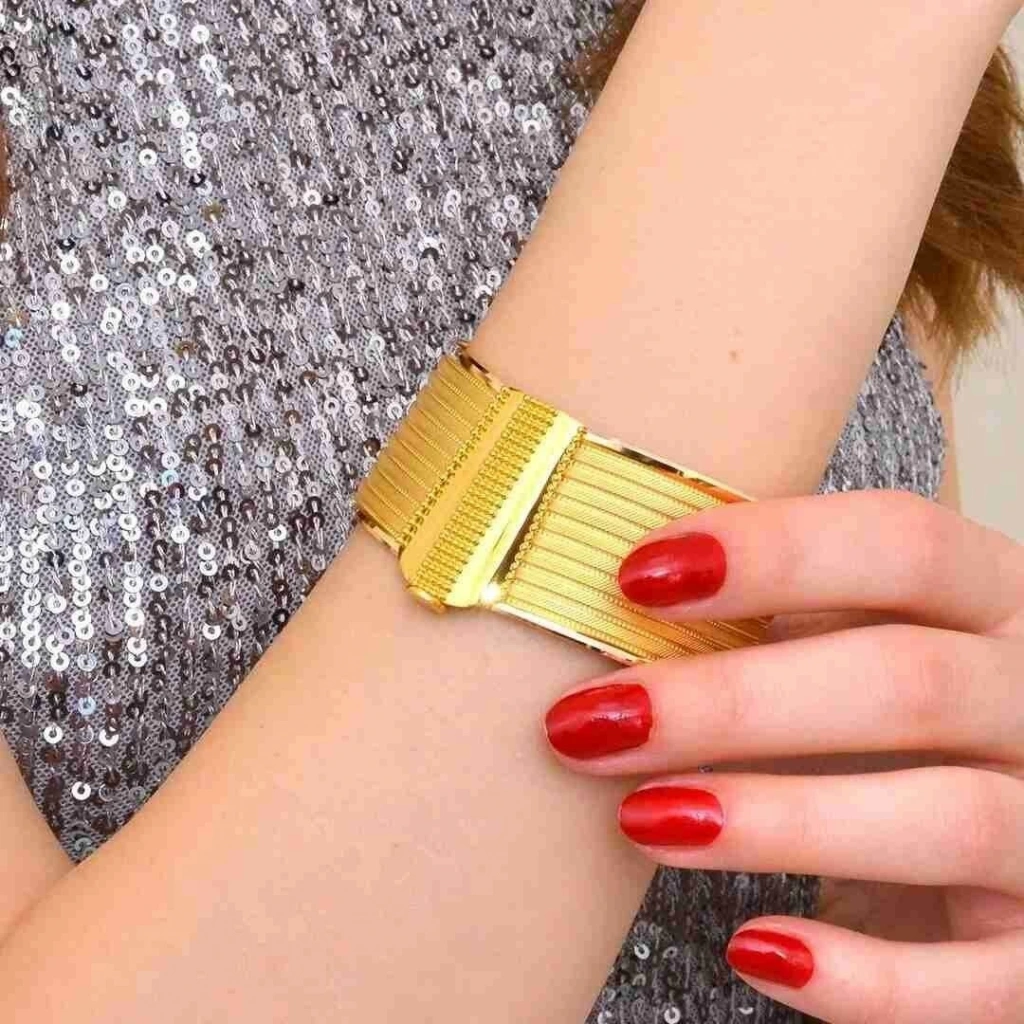 Evla Kuyumculuk'un özel koleksiyonundan 14 Ayar Altın Trabzon Hasır Kelepçe, etkileyici ve gösterişli bir kuyumculuk ürünüdür. Bu kelepçe, yüksek kaliteli 14 ayar altın kullanılarak özenle tasarlanmış ve işlenmiştir. Trabzon hasır deseniyle süslenen bu kelepçe, benzersiz bir görünüm sunar ve her türlü kıyafetle mükemmel bir uyum sağlar. Bu özel kelepçe, 28,02 gram ağırlığıyla sağlam ve gösterişli bir yapıya sahiptir. Bu sayede bileğinizi etkileyici bir şekilde süsler ve şıklığınızı vurgular. Trabzon hasır deseni, kelepçenin üzerindeki örgü detaylarıyla birleşerek göz alıcı bir etki yaratır.