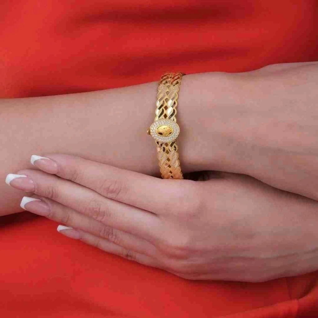 Evla Kuyumculuk'un özel koleksiyonundan 8 Ayar Altın Trabzon Hasır Kelepçe,Zarif ve şık bir kuyumculuk ürünüdür. Bu kelepçe, yüksek kaliteli 8 ayar altın kullanılarak özenle tasarlanmış ve işlenmiştir. Trabzon hasır deseniyle süslenen bu kelepçe, benzersiz bir görünüm sunar ve her türlü kıyafetle mükemmel bir uyum sağlar. Bu özel kelepçe, 12,82 gram ağırlığıyla hafif ve zarif bir yapıya sahiptir. Bu sayede bileğinizi zarif bir şekilde süsler ve şıklığınızı vurgular. Trabzon hasır deseni, kelepçenin üzerindeki örgü detaylarıyla birleşerek göz alıcı bir etki yaratır.