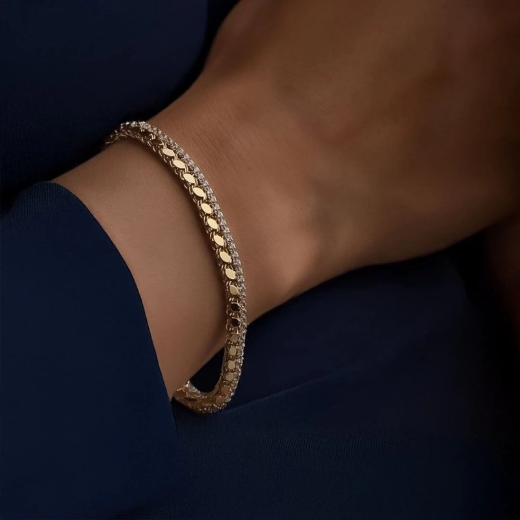 Altın Pullu Suyolu Bileklik,klasik su yolu tasarımına modern bir dokunuş katan zarif pulları ile göz kamaştırır. 14 ayar altından üretilen bu bileklik, 18 cm uzunluğu ve 5,90 gram ağırlığı ile zarafeti ve şıklığı bir arada sunar. Günlük hayatta kullanıma uygun olduğu kadar, özel günlerde de stilinizi tamamlayacak bir aksesuardır.