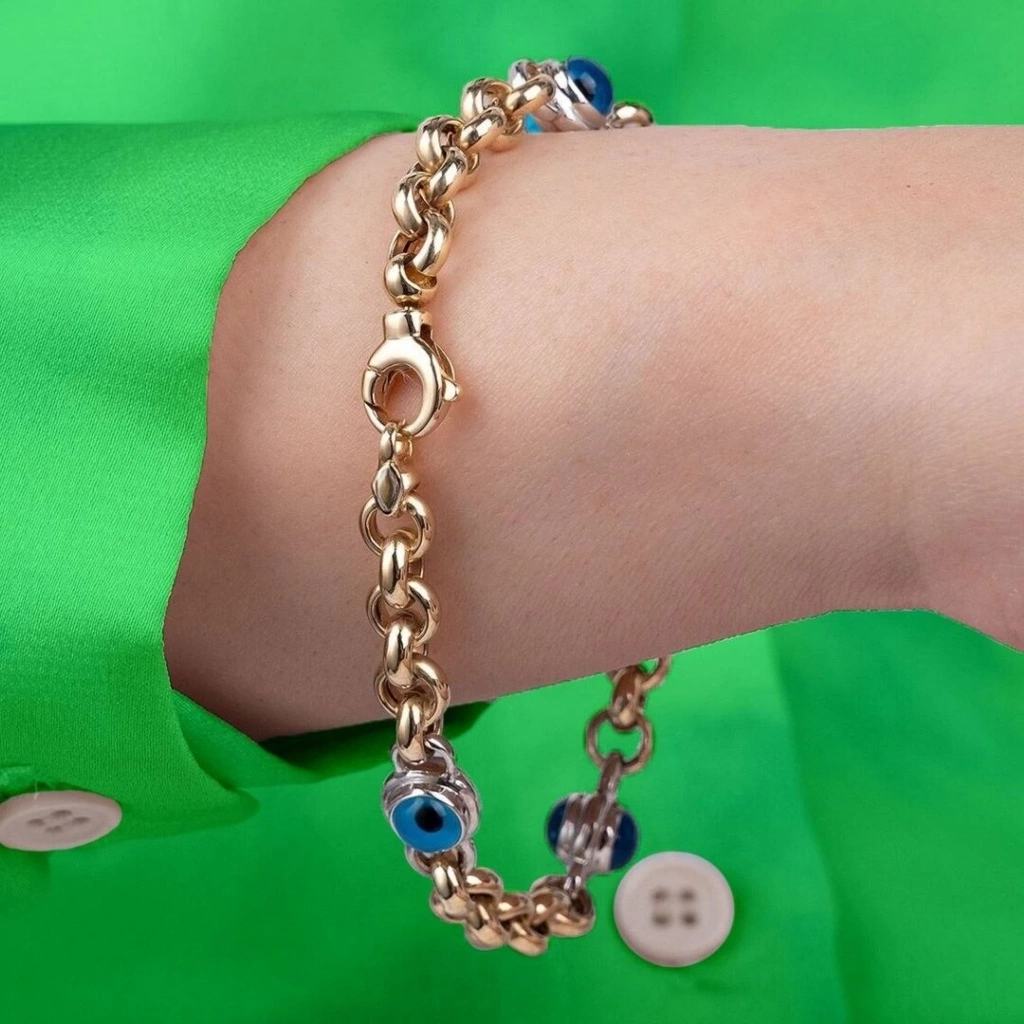 Göz Boncuklu Altın Bileklik detayları, bilekliği farklı kılan ve büyüleyici bir hava katarken aynı zamanda zarafeti ve şıklığı vurgular.